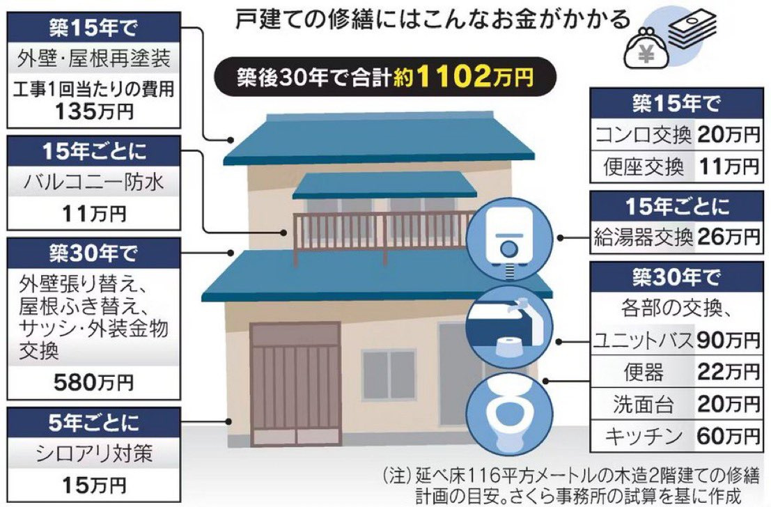 さくら事務所の試算によると、標準的な戸建て住宅の場合、雨漏り防止など基本的な機能維持のリフォームだけでも築30年で総費用は1100万円を超えます。いつ、どんな工事が必要になるかを調べて必要な貯蓄をしておくことが理想です。
