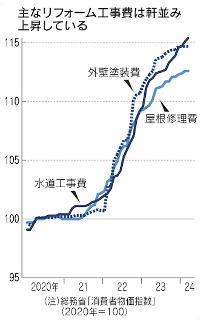 総務省の消費者物価指数(2020年=100)によると住居の外壁塗装、屋根修理、水道工事の足元の料金水準は20年に比べ軒並み15%前後上昇しています。
