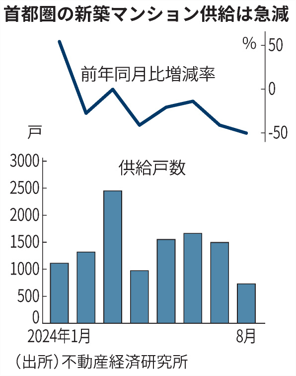 2023年の首都圏のマンション供給戸数は前年比9%減の2万6873戸と、1992年のバブル崩壊直後以来の低水準を記録しました。ピーク時から7割減です。 2024年に入って減少ペースは加速しており、1〜8月の供給戸数は前年同期比22%減となっています。