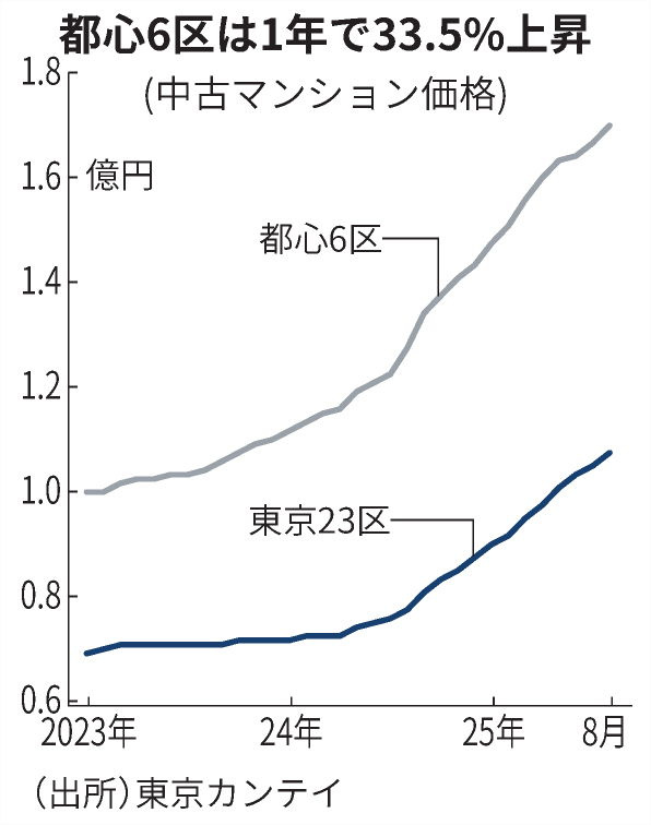 都心の中古マンションの価格上昇が続いていています。2025年8月の平均希望売り出し価格は東京都心6区(千代田・中央・港・新宿・文京・渋谷)で70平方メートルあたり1億7030万円と前月比2%上がり、最高値を更新しました。新築物件の供給が少ないうえに、株高で資産が増えた富裕層らが高額な中古物件の購入へ動き、相場を押し上げています。 不動産調査会社の東京カンテイ(東京・品川)が24日に発表しました。調査は事務所や店舗用を除いた専有面積が30平方メートル以上のファミリータイプの物件を対象としています。 都心6区の価格が1億7000万円台に乗るのは2004年1月の集計開始以来初めてです。前月比の伸び率は6月(0.5%)、7月(1.7%)と月を追うごとに拡大しています。 今年は春以降、都心6区の上昇率は緩やかに鈍化していました。前年比で30%超という高騰ぶりについていけない消費者が増え、相場が息切れしているとの見方が多かったです。 ここにきて伸びが再加速しているのはなぜか。野村証券の福島大輔アナリストは「足元で日経平均株価が最高値を更新するなど株式市場が強く、株高で資産が増えた富裕層が活発に高額物件を買っている可能性がある」とみています。さらに、野村證券は、独自に不動産部門がございまして系列には野村不動産ソリューションズには紹介しないで、買いたいニーズに応えて取引を増やしている感じです。富裕層は、セカンドハウスや転売の目的で購入するケースが多いです。